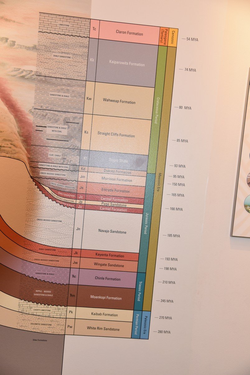 13 photo panorama of a stratification diagram for parts of the Grand Staircase-Escalante National Monument. Modified to show more details and color