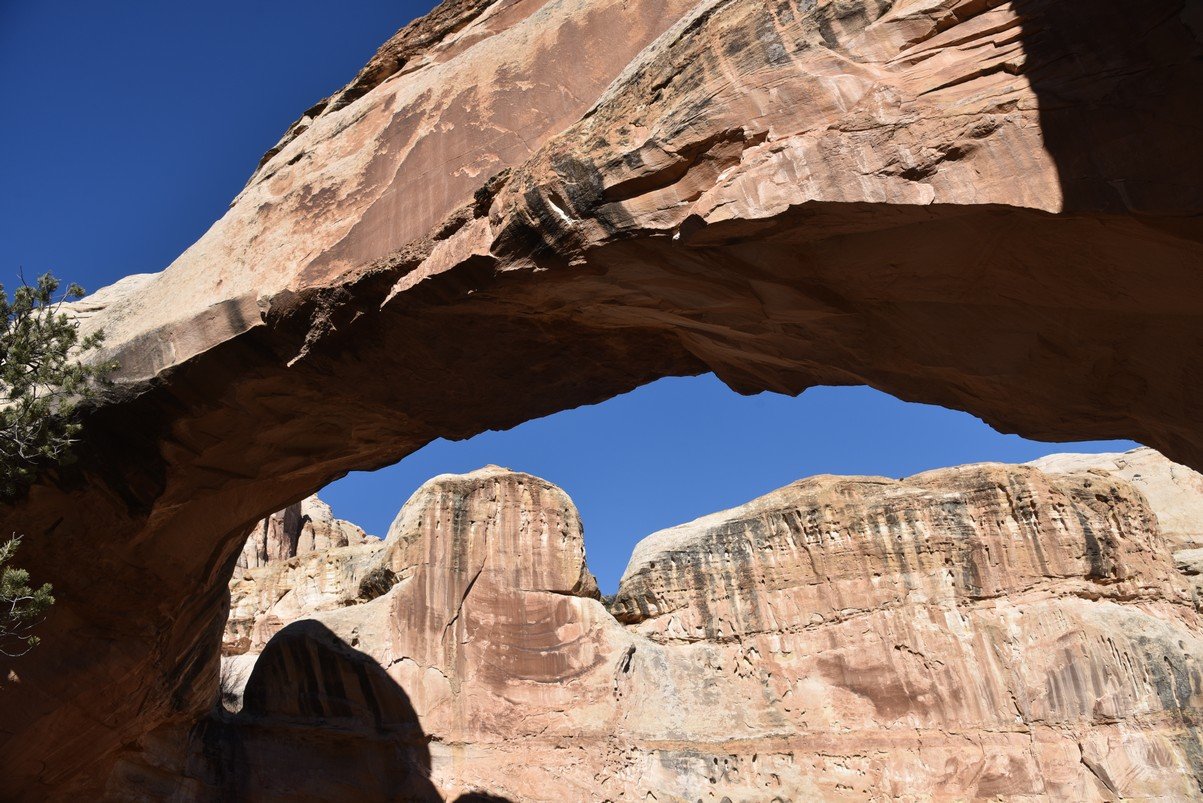 5 photo panorama of the Hickman Natural Bridge in Capitol Reef National Park. It is about 120 feet by 130 feet. Modified to bring out the color and detail.