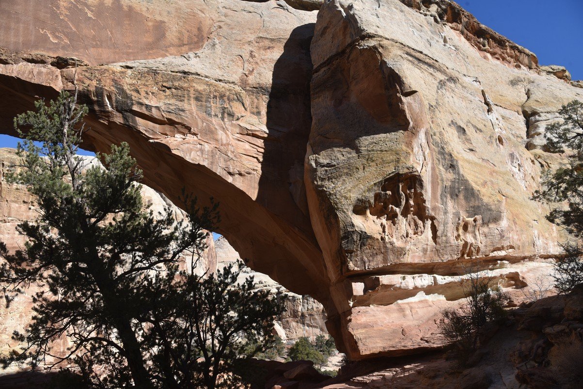4 of 5 photo panorama of the Hickman Natural Bridge in Capitol Reef National Park. It is about 120 feet by 130 feet.