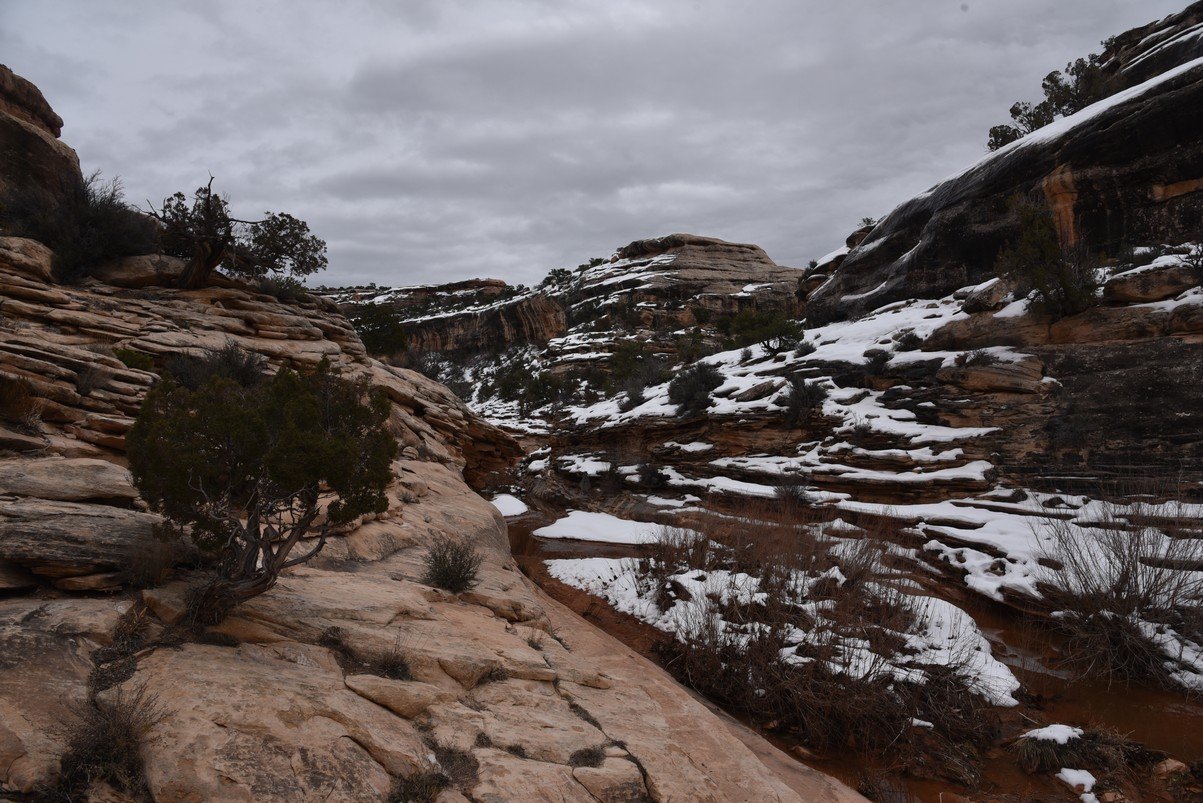 11 photo panorama - Looking under Owachomo Bridge - 106 feet high and 180 feet wide - Natural Bridges National Monument. Modified to show more details and color